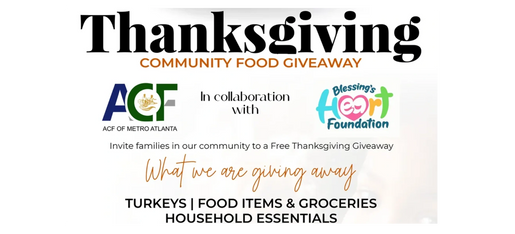 We’re spreading kindness this Thanksgiving season. ACF of Metro Atlanta, in partnership with Blessing’s Heart Foundation, is hosting a community food giveaway to support families in need. Come pick up a turkey, groceries, and household essentials—no cost, no registration, just love and support.